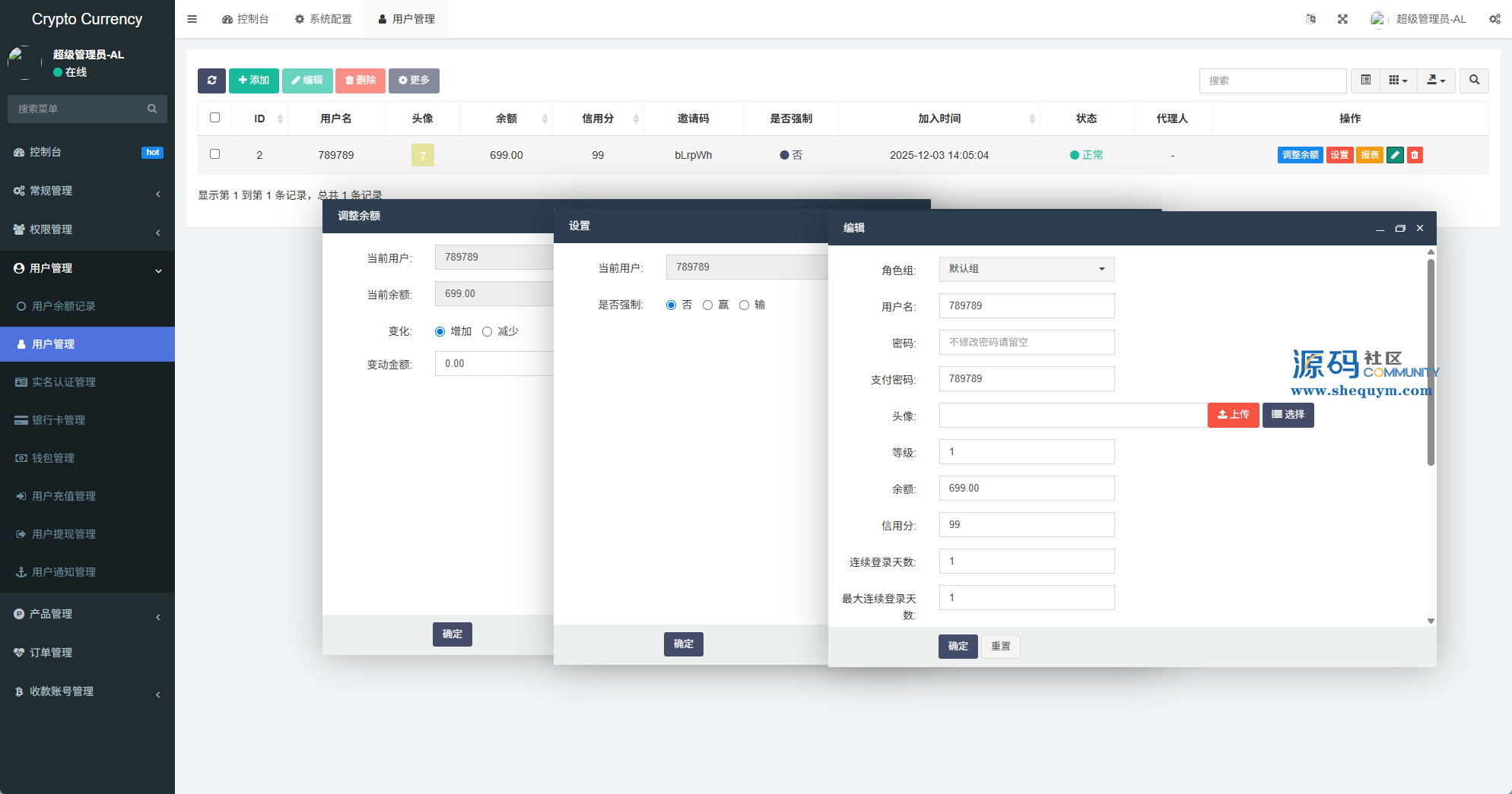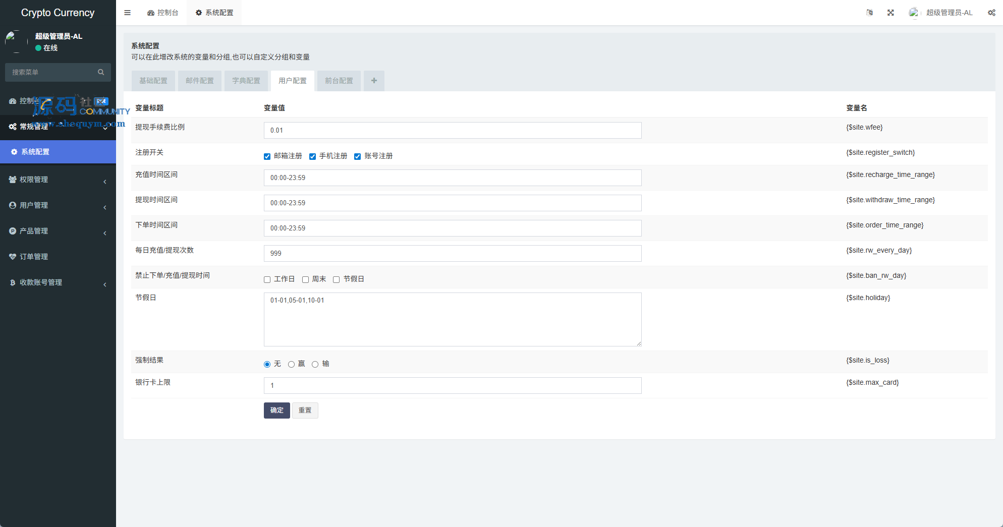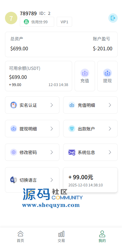 系统功能:信用分,实名认证,银行卡usdt充值提现,用户单控,订单控制等功能