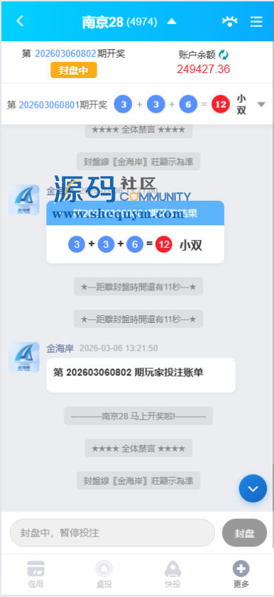 有完整的im即时通讯功能,PC28也是可以聊天下注的,还有桌投、快投、信用投注这三种方式,充值提现都是多渠道,系统彩有预算开奖功能,还是自开奖的不需要添加计划任务