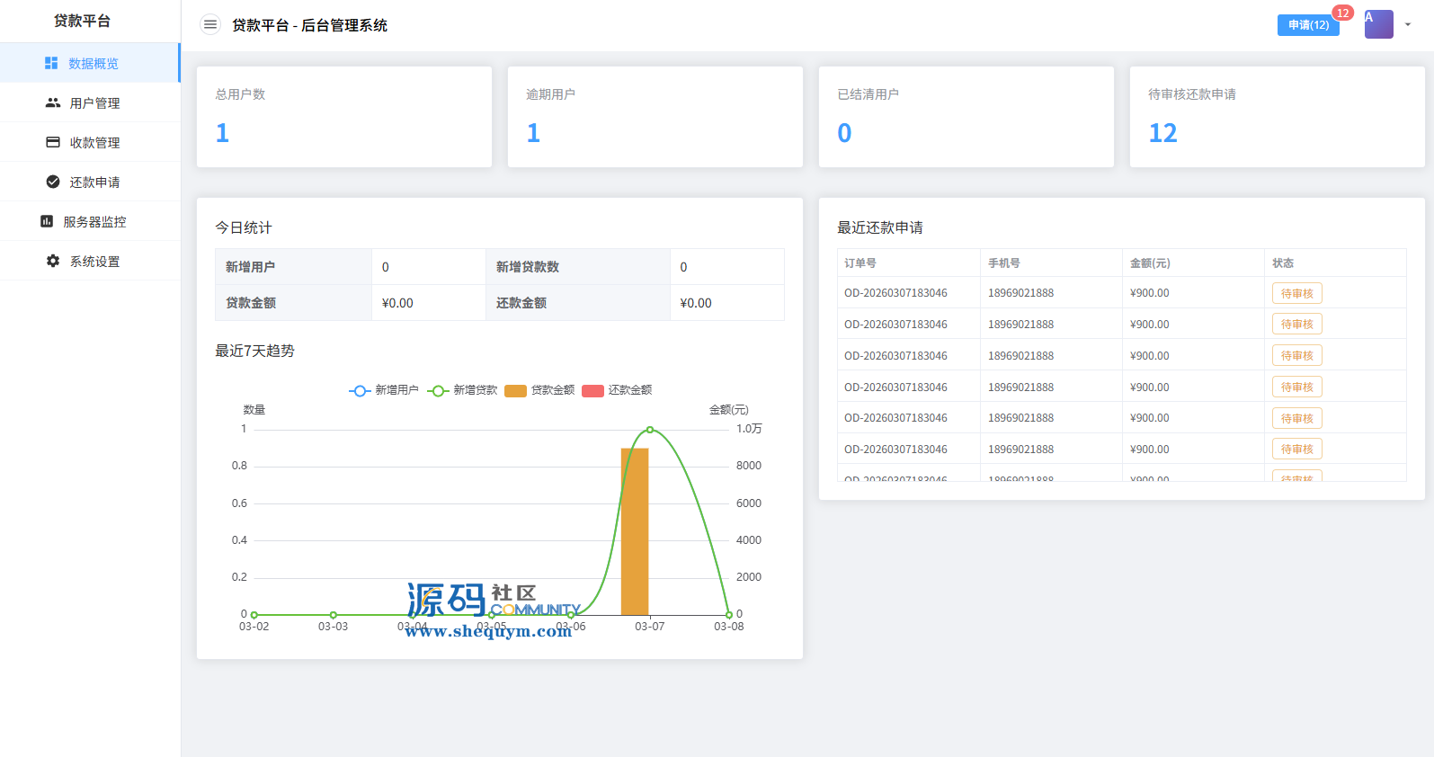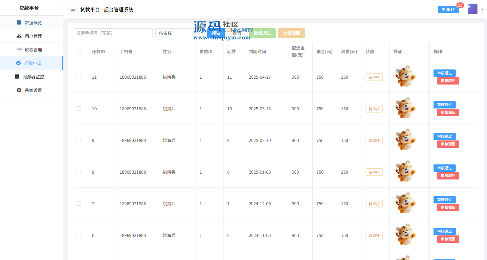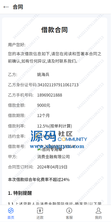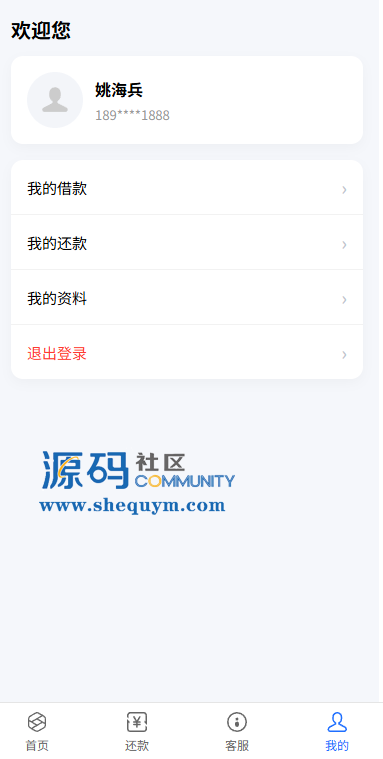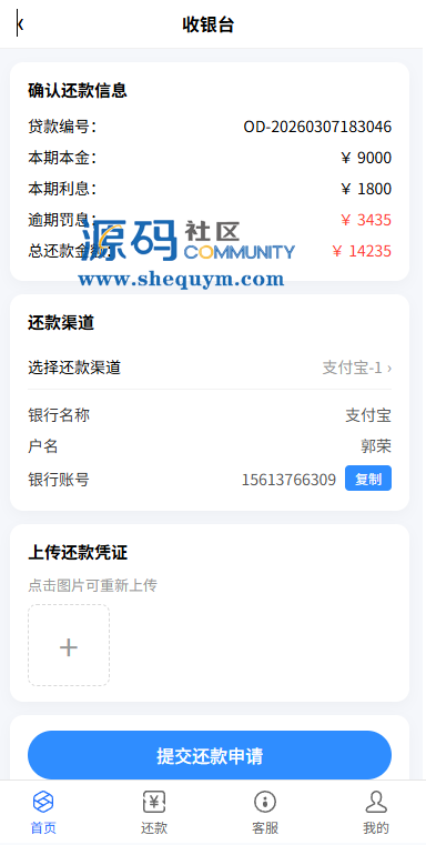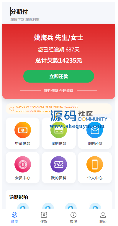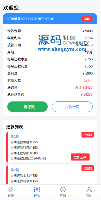 系统前端后台VUE开发,服务端JAVA开发全开源带源码后台可一键填充用户数据生成贷款逾期前端用户手机登陆,就能查看自己的欠款信息